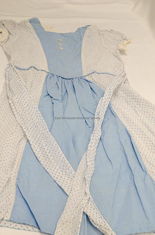Dress, Child Day Dress; Blue panel with blue dotted swiss dress, C. 1938-40, handmade for daughter by Margaret Davis Duff.Made/Created