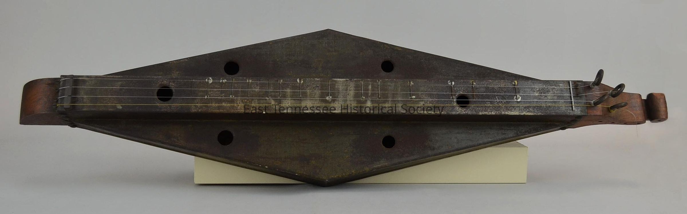 Dulcimer believed made by Andrew J. Robertson* and owned/played by Powell Henderson Crosby, tin body** with walnut ends attached by rounded tacks, separate pieces of metal for top/bottom/two sides, seams bent and welded together, small metal rods welded to top, six 1/2" holes punched and edges rounded--two on bridge/four on body, one end shaped into scroll with decroative holes in circles/opposite end simple rounded foot, screw eyes hold three silver-colored metal strings and one gold, 34 1/2"h x 8 1/4"w x 3"d/4 3/4"d at end with tuners, c. 1930s.