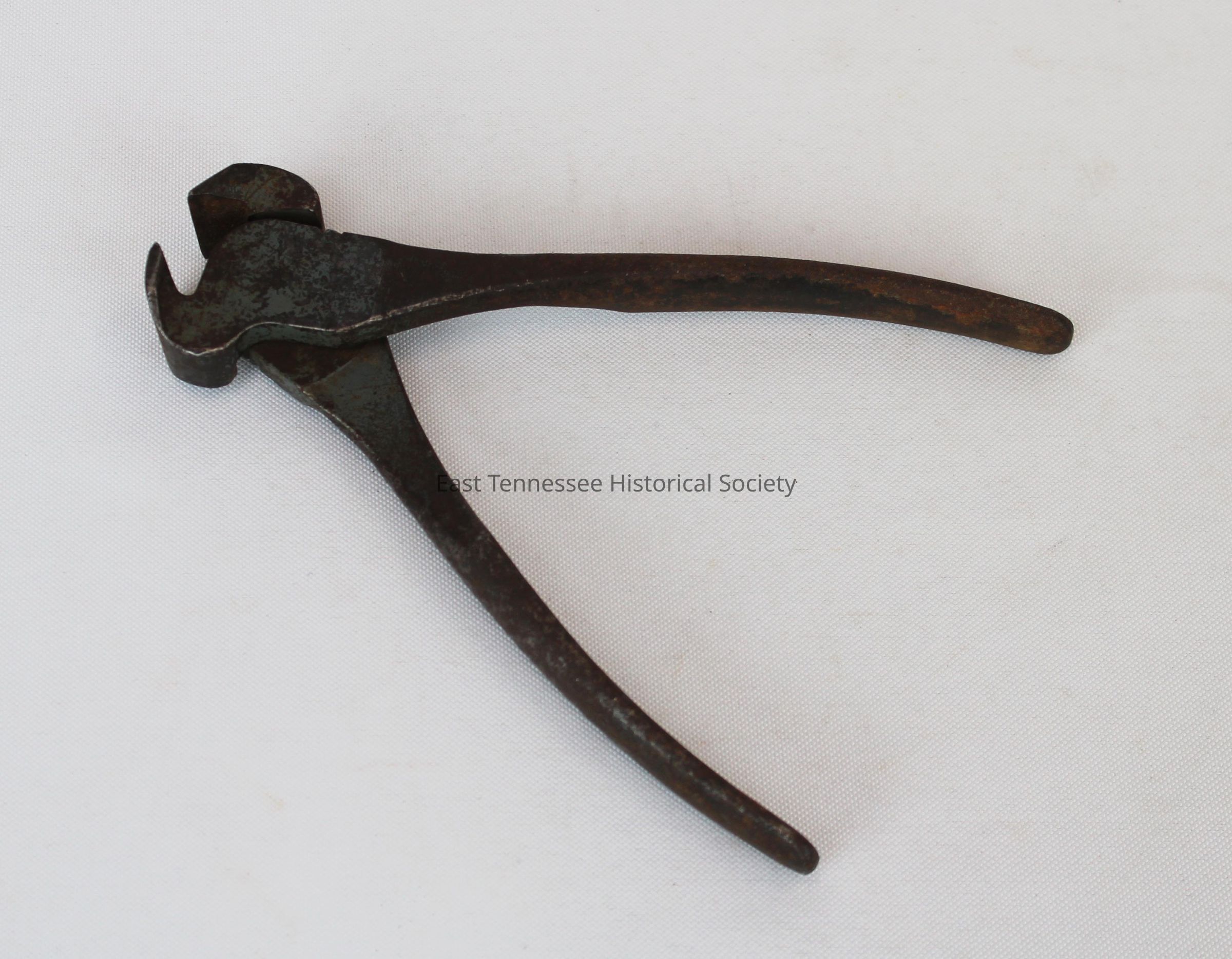 Nail nippers (look like pliers) for horeshoes, two pieces of metal held together by peg and socket, edge has flat head and can clamp down on an object, company logo on one side imprinted by the head that reads "CRESCENT TOOL CO./72/6/WESTOWN N.Y." and on the other side in the same place it says "CRESTOLOGY," 6 1/4"h x 1 1/2"w x 3/4"d.Made/Created