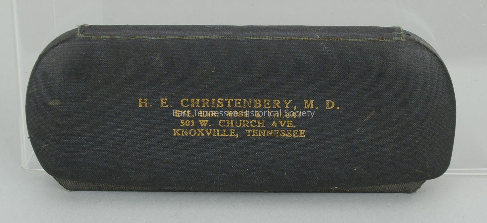 .1) Eyeglasses case, black imitation leather, hinged, front marked "H. E. CHRISTENBERY, M.D. / EYE, EAR, NOSE & THROAT / 501 W. CHURCH AVE. / KNOXVILLE, TENNESSEE" in gold lettering, blue-velvet interior with paper label on inner lid marked "THESE ARE GENUINE / Soft-Lite Lenses / CONSERVE VISION VITALITY," 2 1/4"h x 5 1/4"w, date unknown.