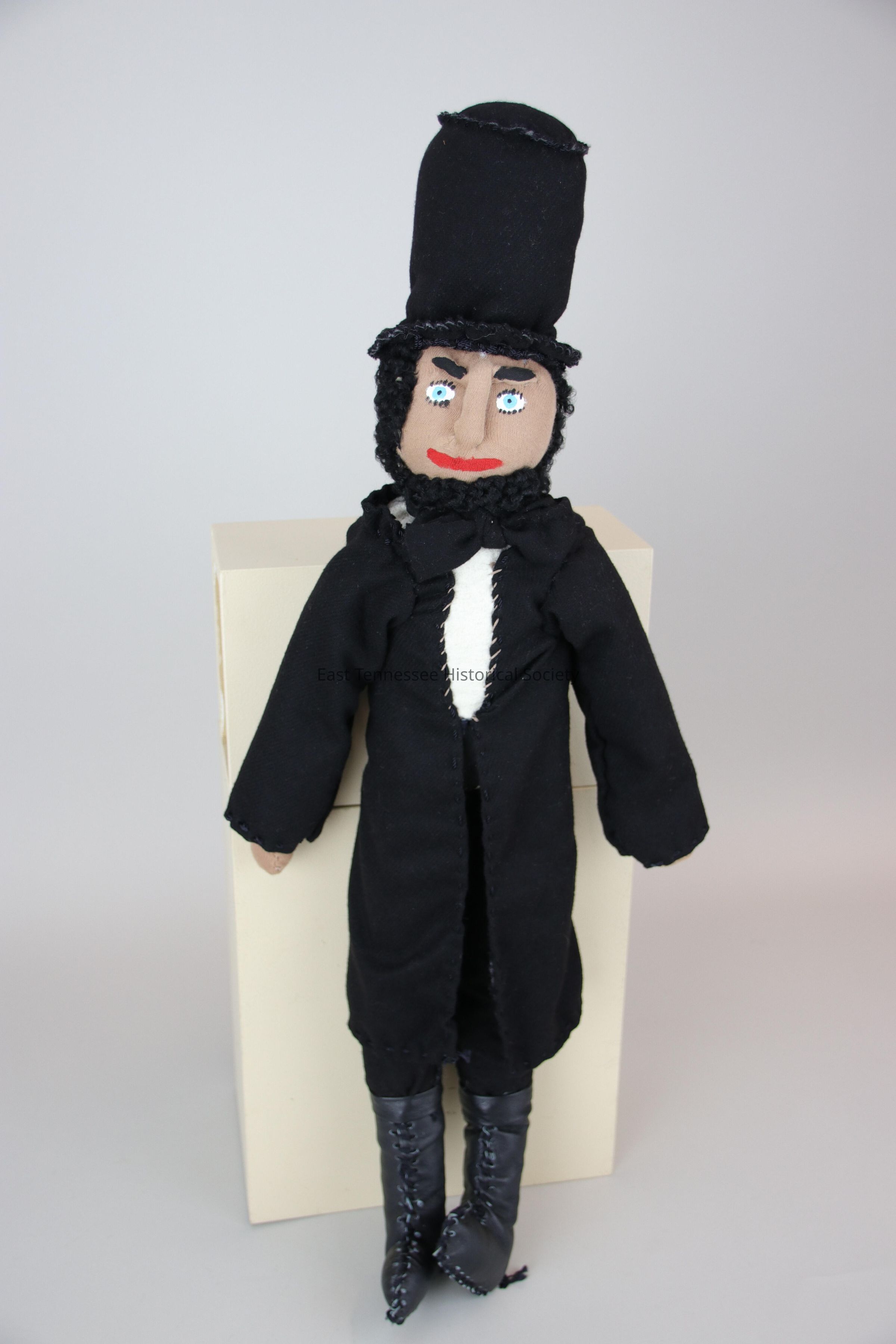 Cloth doll depicting Abraham Lincoln, handmade by Jimmy Morrow, folk-art style with facial features formed by stitching and paint, painted blue eyes/black eyelashes/red upturned mouth, curly black-fiber beard, wears black-wool stovetop hat/frock coat/pants, black imitation-leather lace-up boots, left leg longer than right, 28 1/2"h x 8"w, March 2011.