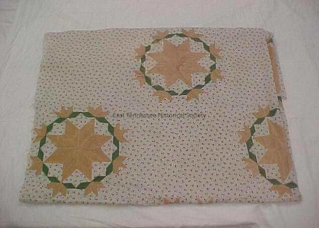 Quilt top, star pattern (star within circle of stars) in beige and green, 1880-1900 (based on the beige; probably faded from red which was common in the last quarter of 19th century).*