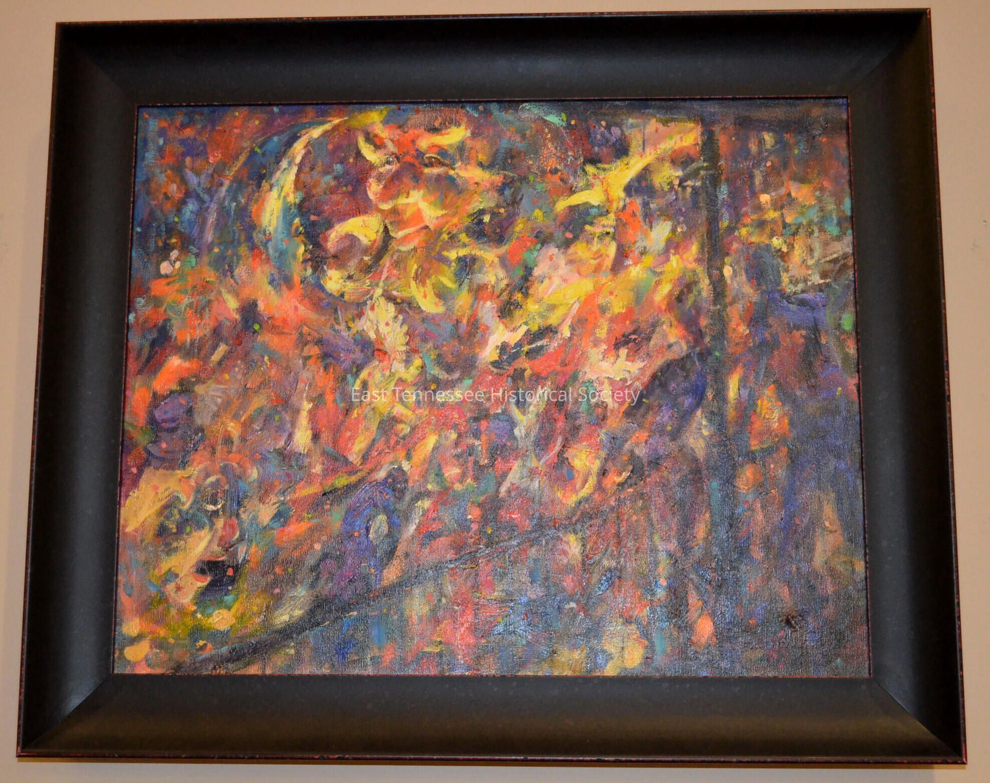a) Paintig entitled "Fat Tuesday" by Jim Gray, dabbed oil/heavy brushstrokes--yellows/purple/orange, abstract depiction of Mardi Gras reverie--black iron railing with two figures, unsigned?, date?