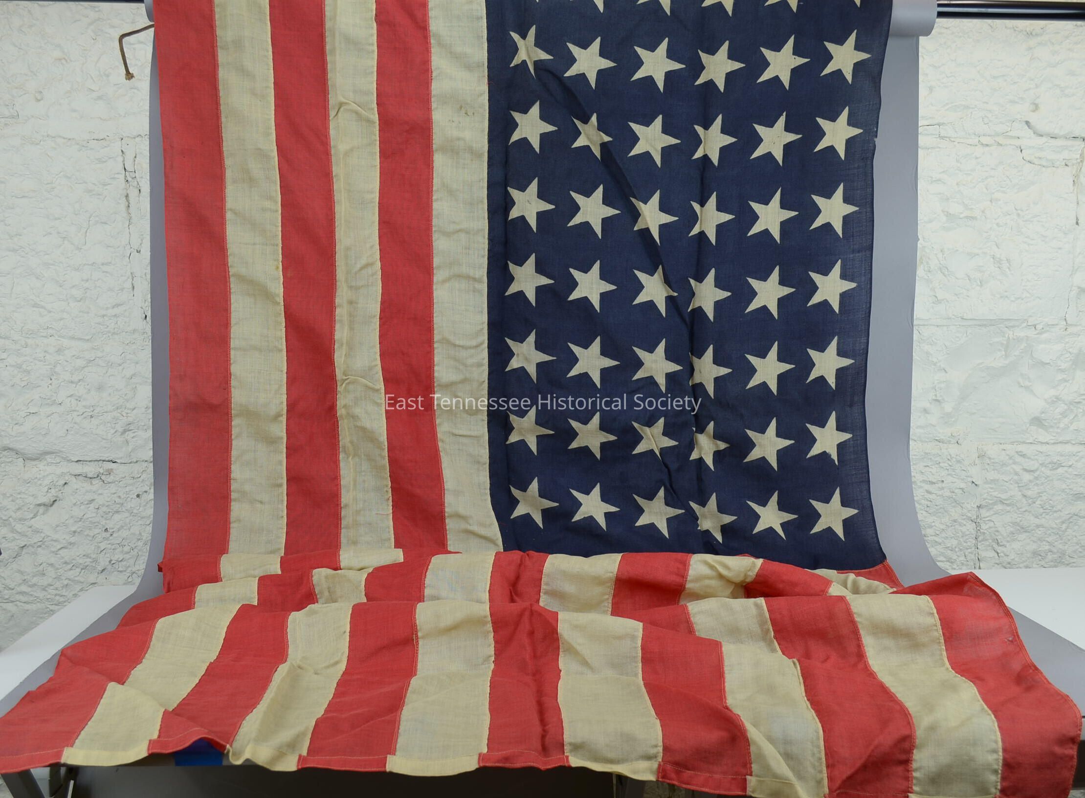 a) American flag that flew over Knotty Ash rest camp (Liverpool), cotton, red-and-white sewn stripe with sewn inset with 48 printed stars on dark blue ground, canvas pocket sewn to left side for rope, unknown manufacturer, 59 1/2"h w/cord [52"w/o cord) x 92"w, WWI/probably 1918.