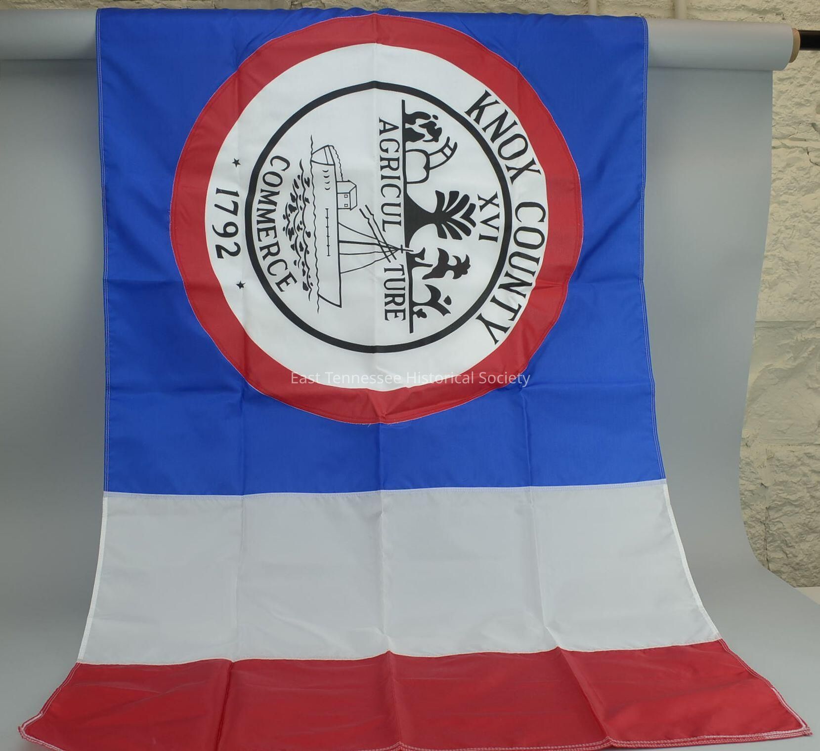 Bicentennial flag of Knox County, red/white/blue nylon fabric, white circle at pole end with Tennessee state seal bordered at top by "KNOX COUNTY" and at bottom by "1792," metal grommits, manufactured by Conder Flag Company (Charlotte, NC), 36"h x 60"w, 1992.Collection