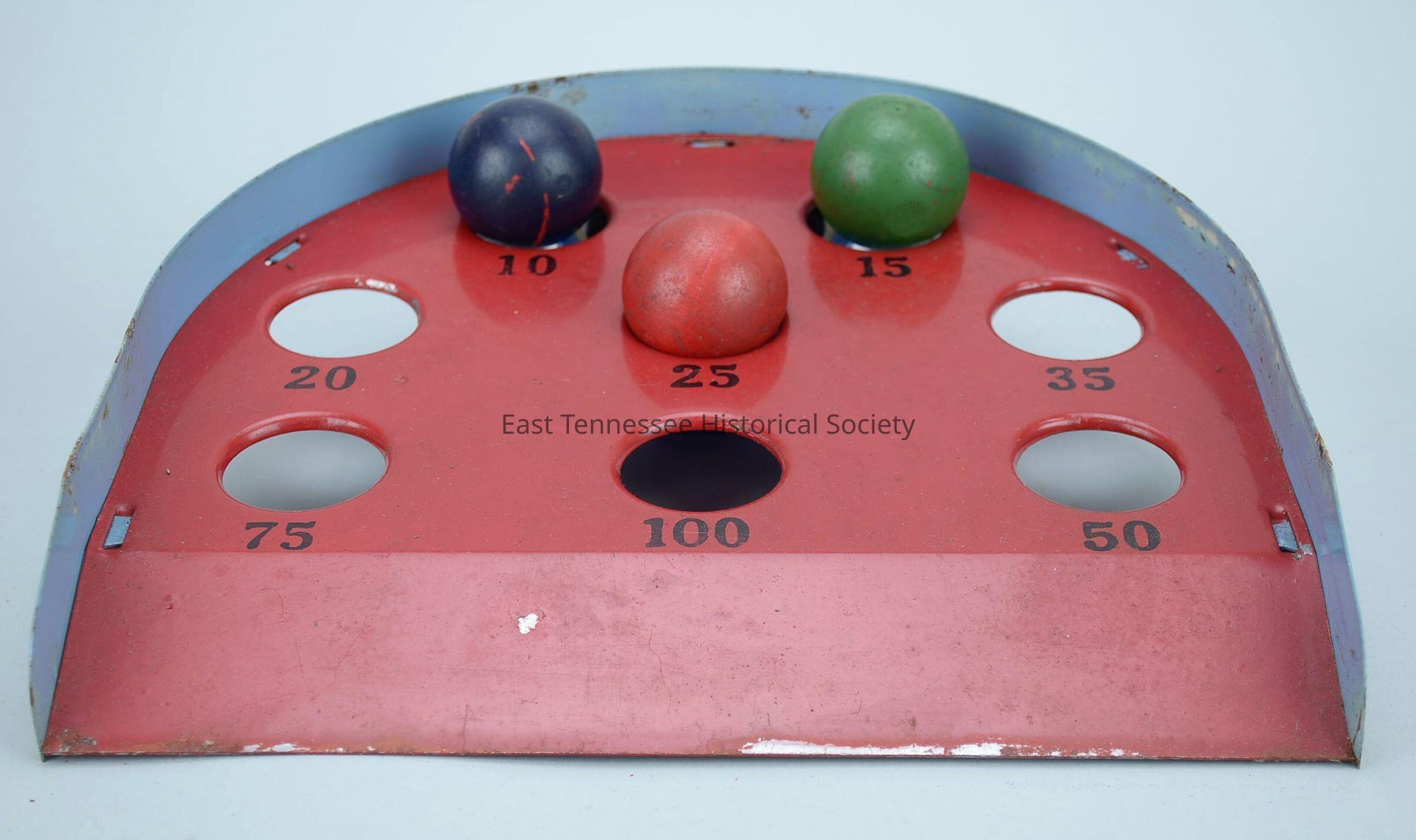 a) American Roll Game skee ball, No. 6 G-3, 1 3/4"h x 12"w x 11 3/4"d red metal plate with horseshoe-shape blue fender, slanted front with eight indentions each marked with different number, Louis Marx & Co. (New York Office, 200 Fifth Ave.), early 20th century.