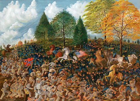 "General Sanders Receives His Mortal Wound," W. R. Briscoe, oil on board, signed "W. Russell Briscoe" and dated bottom right, 23 1/2" x 31 1/2" with 3" wood frame with gold lip, 1960.Collection