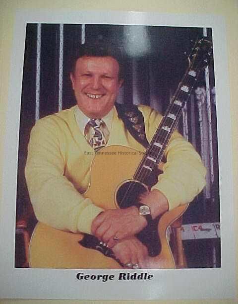 Color publicity photograph of George Riddle holding guitar, marked "George Riddle" under image, 11"h x 8 1/2"w, c. 2000.