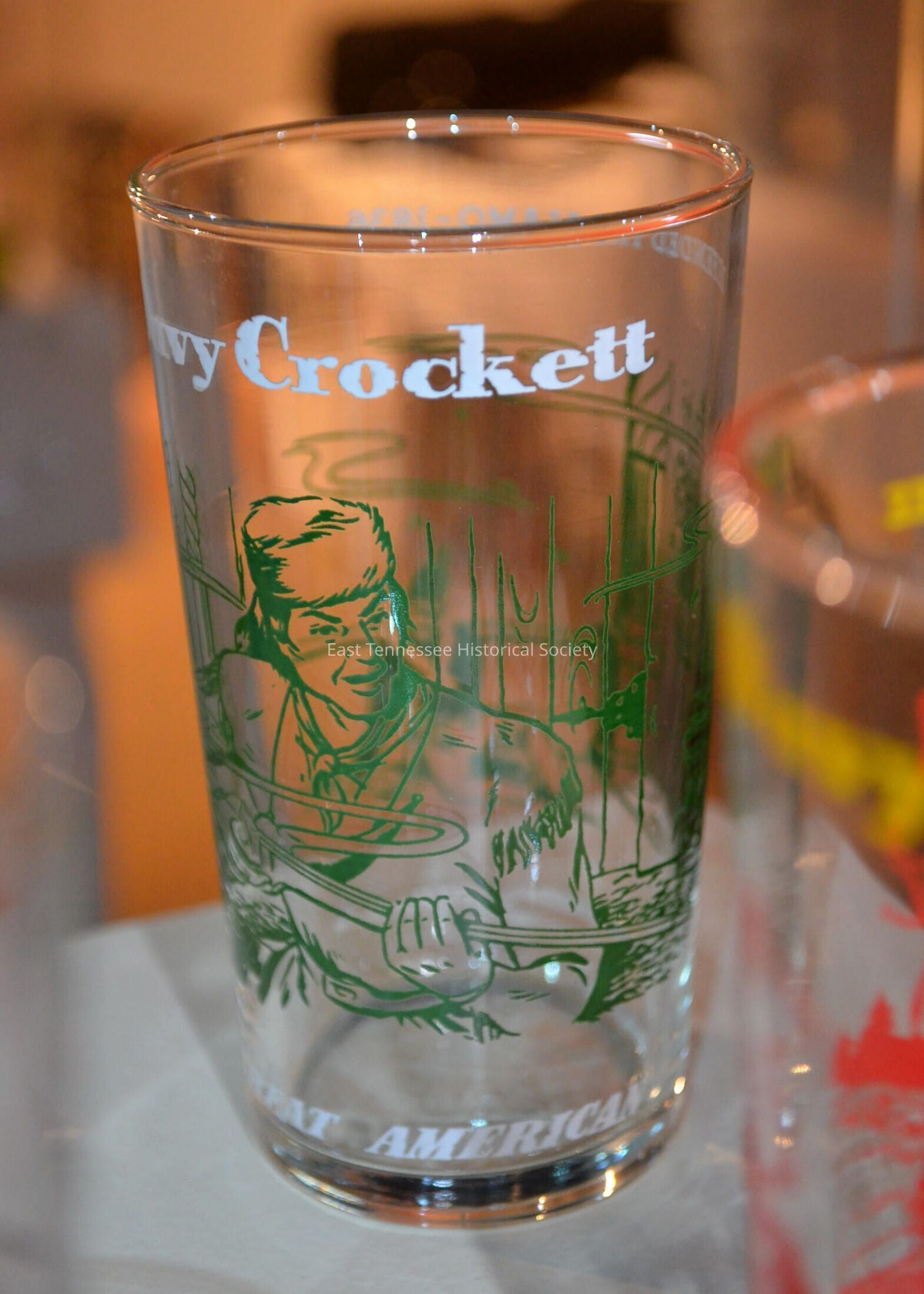 Drinking glass marked "Defended the Alamo -- 1836 Great American" in white, scene depicts Davy Crockett (wearing coonskin hat, fringed jacket) with gun powder horn and rifle at the Alamo with wounded Mexican soldier, illustration in green, 4.1"h x 2.9" diam., 1950s.Dimensions