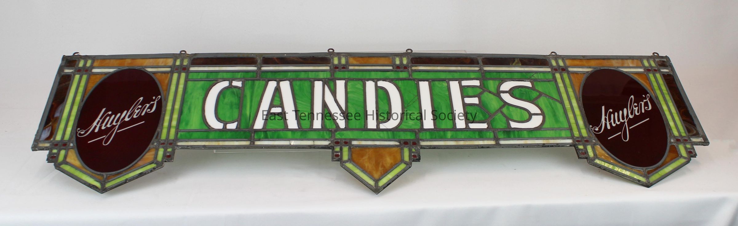 Stained-glass advertising sign from Bunting's drugstore (Bristol, Tenn.), marked "HUYLER'S" ... "CANDIES" ... "HUYLER'S" in end sections with latter written in cursive white and surrounded by red, "CANDIES" middle portion in green with white block letters, decorative rectangles and triangular shapes coming from mid and end sections for decoration in brown/green/orange/blue tones, six metal loops at top to hold chain for display, 15 1/2"h x 53 3/8"w x 7/8"d, c. 1915.Collection