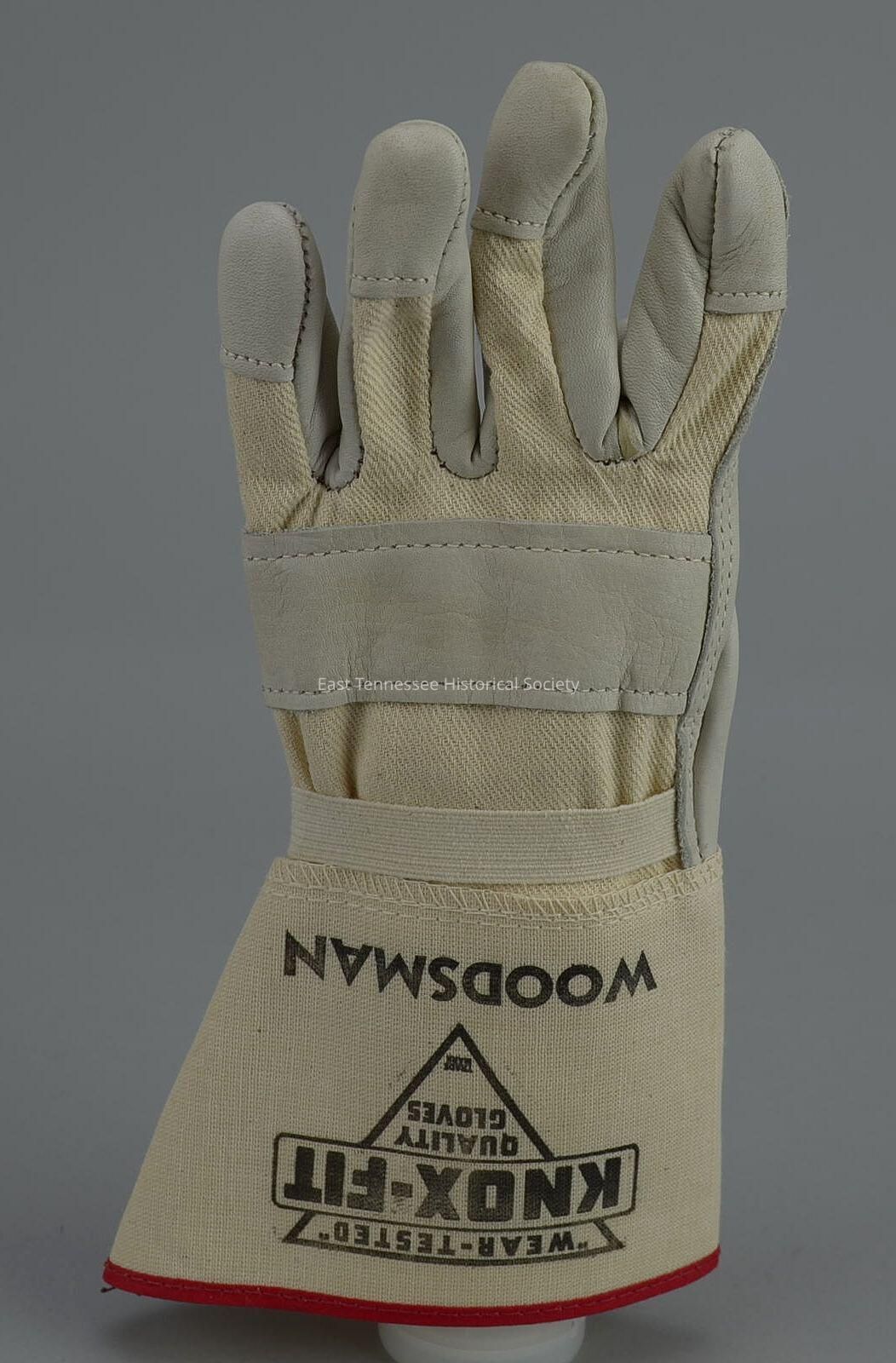 Pair of gloves, light green-gray smooth leather and off-white cotton with red cotton trim, gun cut with bell gauntlet cuffs,"'WEAR-TESTED' / KNOX-FIT / QUALITY / GLOVES / WOODSMAN" printed in black, "B6429 / UNION [image of machine] / ACWA," Knoxville Glove Co. (Knoxville), 10 1/2"h x 5 3/8"w, c. 2013.Collection