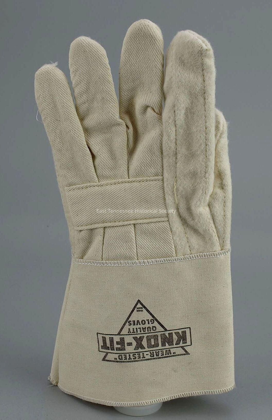 Pair of gloves, off-white flannel and off-white cotton, clute cut, band-top cuffs, size large, "'WEAR-TESTED' / KNOX-FIT / QUALITY / GLOVES," marked in black letteringmarked on cuff, Knoxville Glove Company, 12 3/4"h x 7 1/2"w, c. 2013.