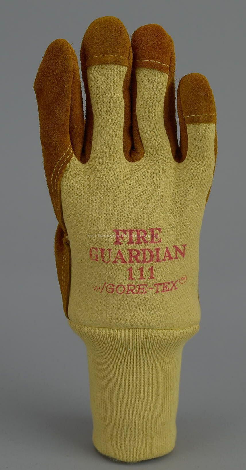 Glove (right hand), rust-brown rough leather and yellow cotton, gun cut, knit wrist cuff, "FIRE / GUARDIAN / 111 / GORE-TEX,[trademark in red lettering]" S [in circle] marked on back, size small, Knoxville Glove Company, 12"h x 4 3/8"w, c. 2013.Collection