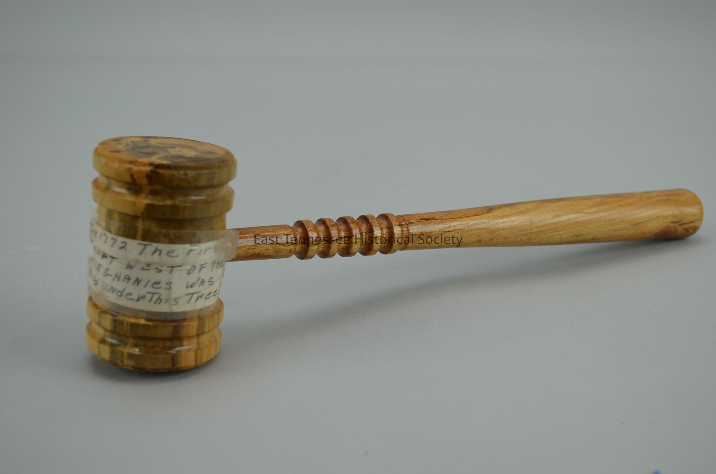 Gavel made of sycamore wood, short section of turned ornamental design--series of equally-spaced indented rings--near top of handle,12"h x 3 1/8"w at head/1"w handle, c. 1987.Made/Created