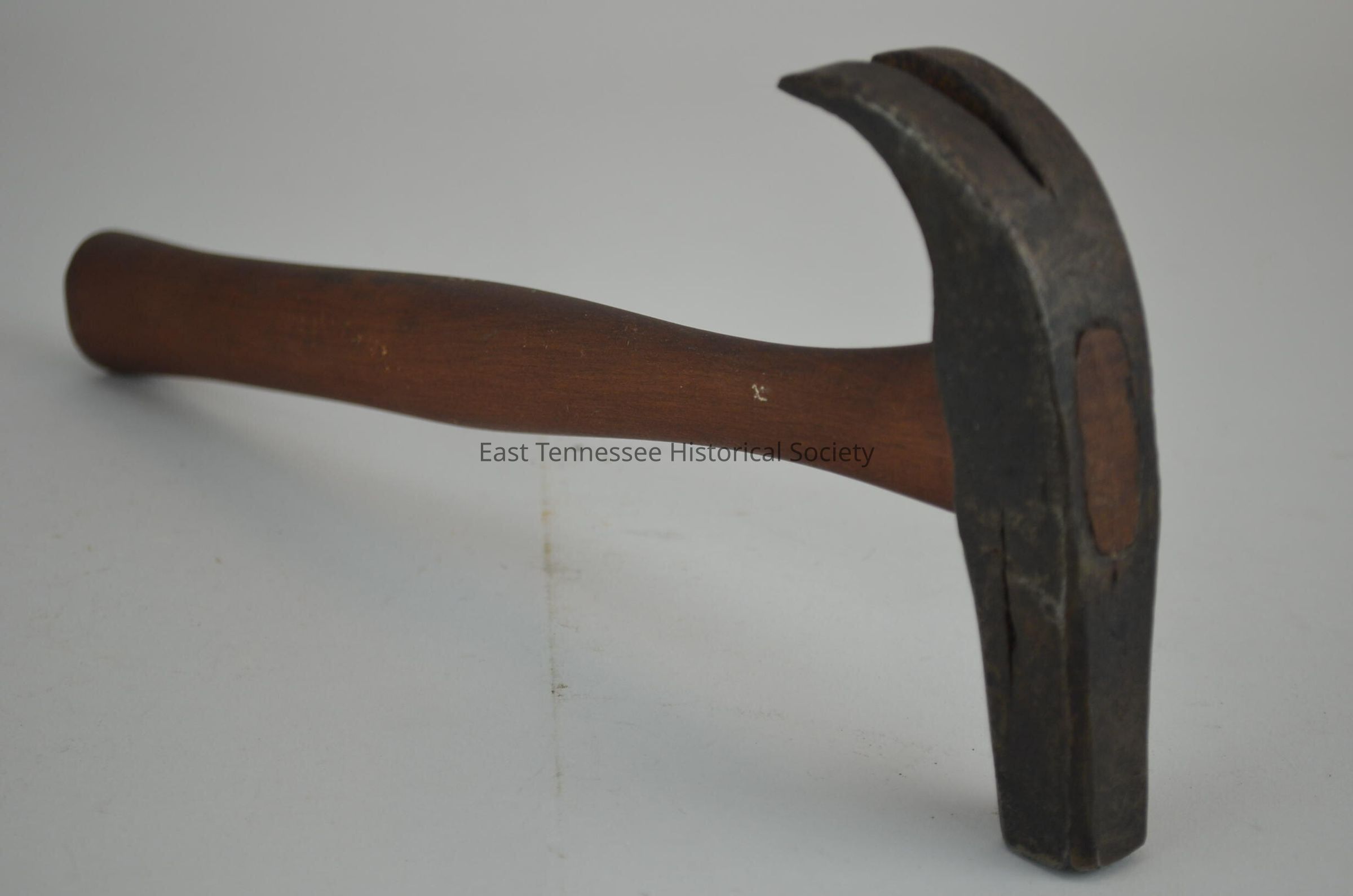 Carpenter's claw hammer, two piece consisting of hand-forged head of simple design and inset tapered wood handle, head with hard-steel front set into wrought iron, two all-wood wedges at handle top spread wood into rectangular space at mid-head, all handmade/assumed by owner William Barlow Murphy, 12 3/4"h x 5 3/8"w x 1"d., date could range from 1840s-1870s/most likely post-Civil War* (one of three oldest items in Murphy collection).