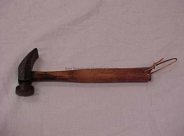 Small hammer used by a cobbler. Top of hammer has a round head with a pinched neck. Back of hammer curves down into a solid claw set into a wooden handle with a tapered neck. Small hole in bottom of hammer handle with a narrow metal loop for hanging hammer.Collection