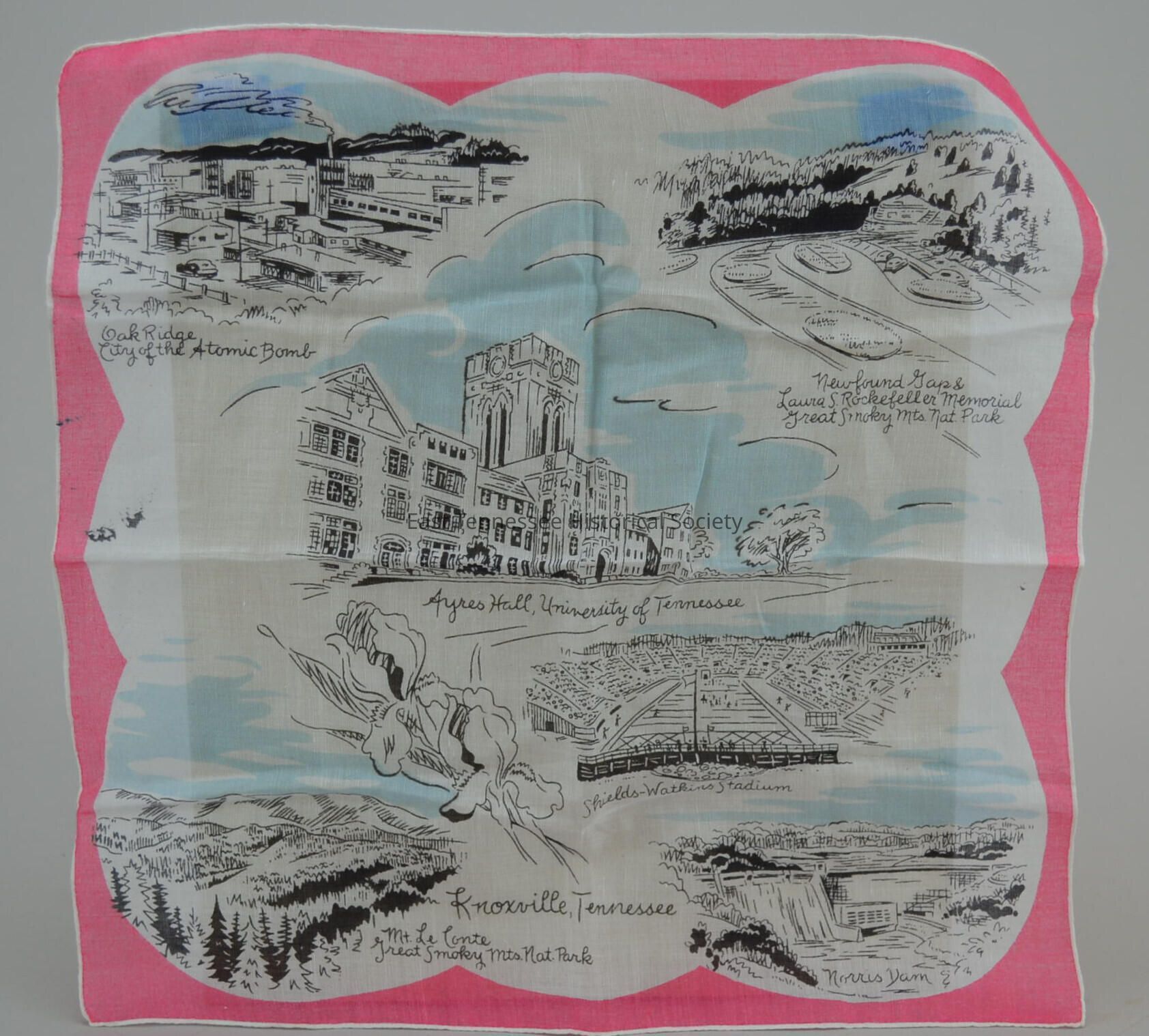 Souvenir woman's handkerchief, white cotton with rosy-pink scalloped border, marked "Knoxville, Tennessee" in script below illustration of two iris blossoms [state flower], black on white illustrated regional scenes/attractions with pale-blue skies--"Oak Ridge / City of the Atomic Bomb" in script at upper left - shows numerous small buildings with car on road at front and ridgeline behind, "Newfound Gap & / Laura S. Rockefeller Memorial / Great Smoky Mts. Nat. Park" at right corner - shows view from above memorial looking out to the landscape, "Ayres Hall, University of Tennessee" at center - view toward window with tree to right, "Shields-Watkins Stadium*" (below center) - football game with players on field and fans in bleachers, "Mt. Le Conte / Great Smoky Mts. Nat. Park" - mountains at distance with evergreens in foreground and "Norris Dam" at lower corners- dam with hills and trees around it, 13 1/4" square, probably 1940s-1950s*.