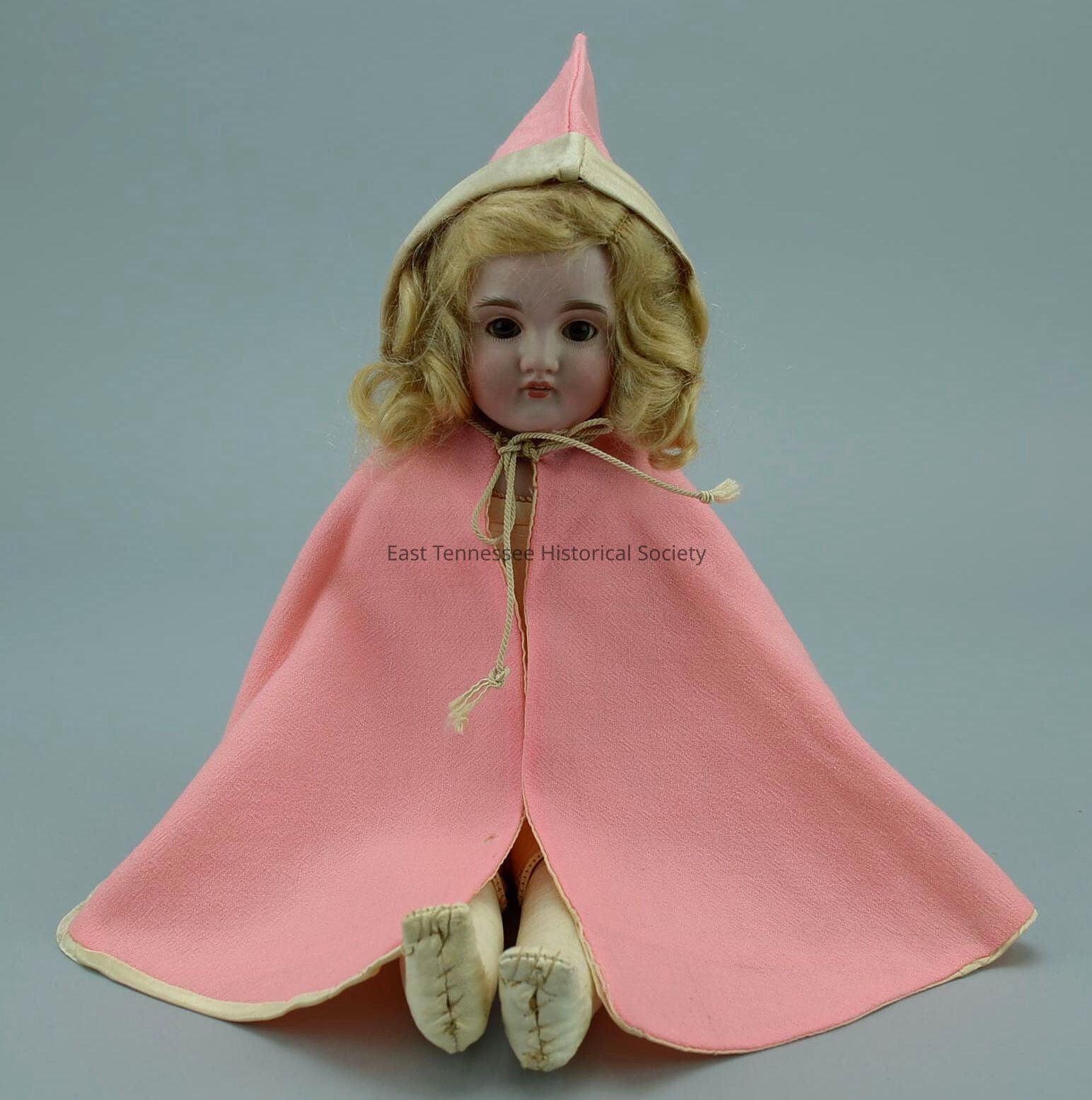 .1) Hooded cape made (by tradition) by Margaret Cecil Peak Bundren, pink light-weight wool crepe with white silk lining and trim, half circle with white cord tie at neck, white silk trim around face of cape, 13"h x 4", 14" at hem, c. 1911.Made/Created