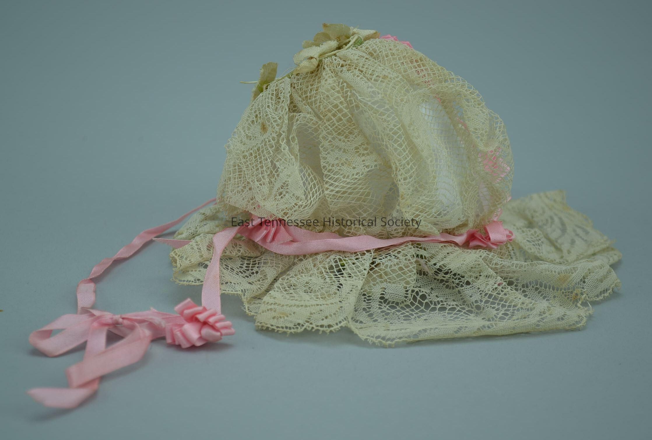 .1) Doll hat made (per tradition) by Margaret Cecil Peak Bundren, lace pouf gathered onto green mesh circle with spray of artificial flowers, pink ribbon and bows trim, brim lace ruffle sewn to pouf with spray of flowers under brim, additional pink ribbon/bows/streamers, 3"h x 9"w.Made/Created