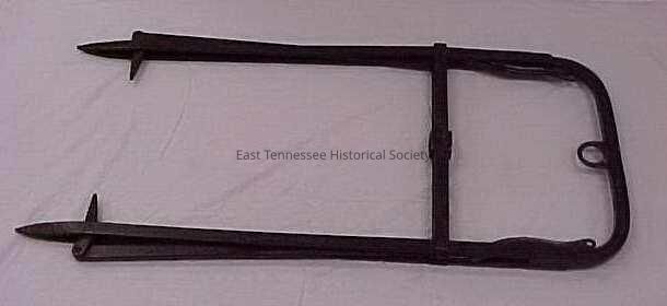 Hayfork used to take loose hay from wagon up into barn. "A" shaped frame construction. Small loop present on interior side of frame top. A hollow cylinder is present in center of horizontal cross beam. Bottom of long sides end in pointed steaks. Levers control a mechanism in side legs controlling a second pair of stakes. When levers are parallel to the legs of the frame horizontal stakes are extended into the hay when the levers are perpendicular to the legs of the frame the horizontal stakes are pulled inside the frame.Collection