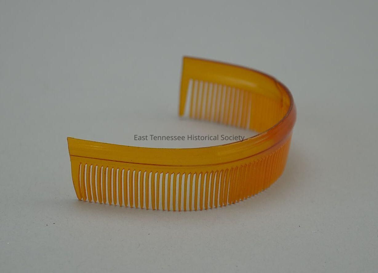 Doll comb headband, amber plastic half circle with 3/8" long teeth, unknown manufacturer, 5/8"h x 2 1/2"w, c. 1911.Made/Created