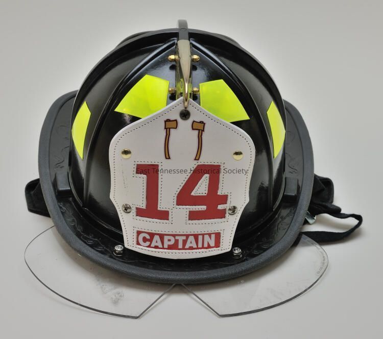 Captain's helmet from Ladder Company 14, certified model NFPA 1971, black molded plastic with two-piece white leather shield at center front, shield marked "14 [in red] / CAPTAIN [in white on red]" with two mirror-image ax decals above 14, shield held at top point by beak of three-dimensional gold-colored metal eagle mounted to top edge of helmet, eight yellow reflector patches encircle helmet at top, leaf design in relief atop shallow front brim/floral-and-leaf design continues along back brim, hinged two-piece clear-plastic face shield extends from under front brim/decal attached under proper left piece marked "SE MP #EZANS1, Z87+/NFPA 1971. 2007 ED," copper-colored metal D-ring attached to center back brim for hanging, padded interior marked "Morning Pride Manufactured / #1 Innovation Court, Dayton, OH 45414 / phone 937-454-4925 Fax 937-264-0075," ear covers, Morning Pride (Dayton, Ohio), 9 1/2"h x 11 1/2"w x 18"d, 2007.Collection