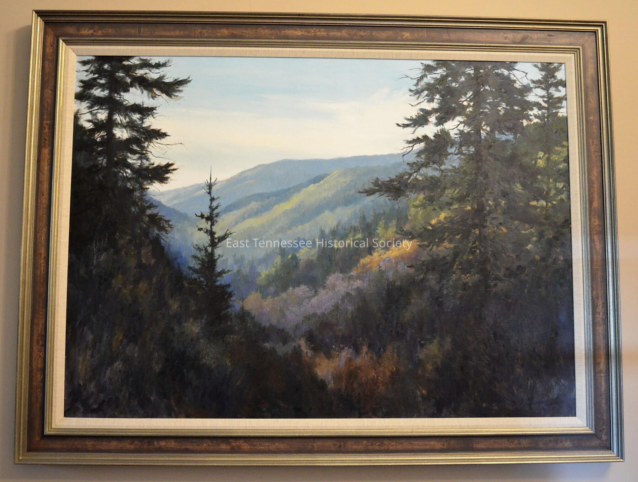 a) Painting entitled "High in the Smokies" by Jim Gray, oil on canvas, depicts Smoky Mountain landscape with dark-green trees in foreground and more in background with other colors indicating approach of autumn, top half shows open blue sky and white clouds, signed "Jim Gray" in lower right corner, 39"h x 50"w, 2001.