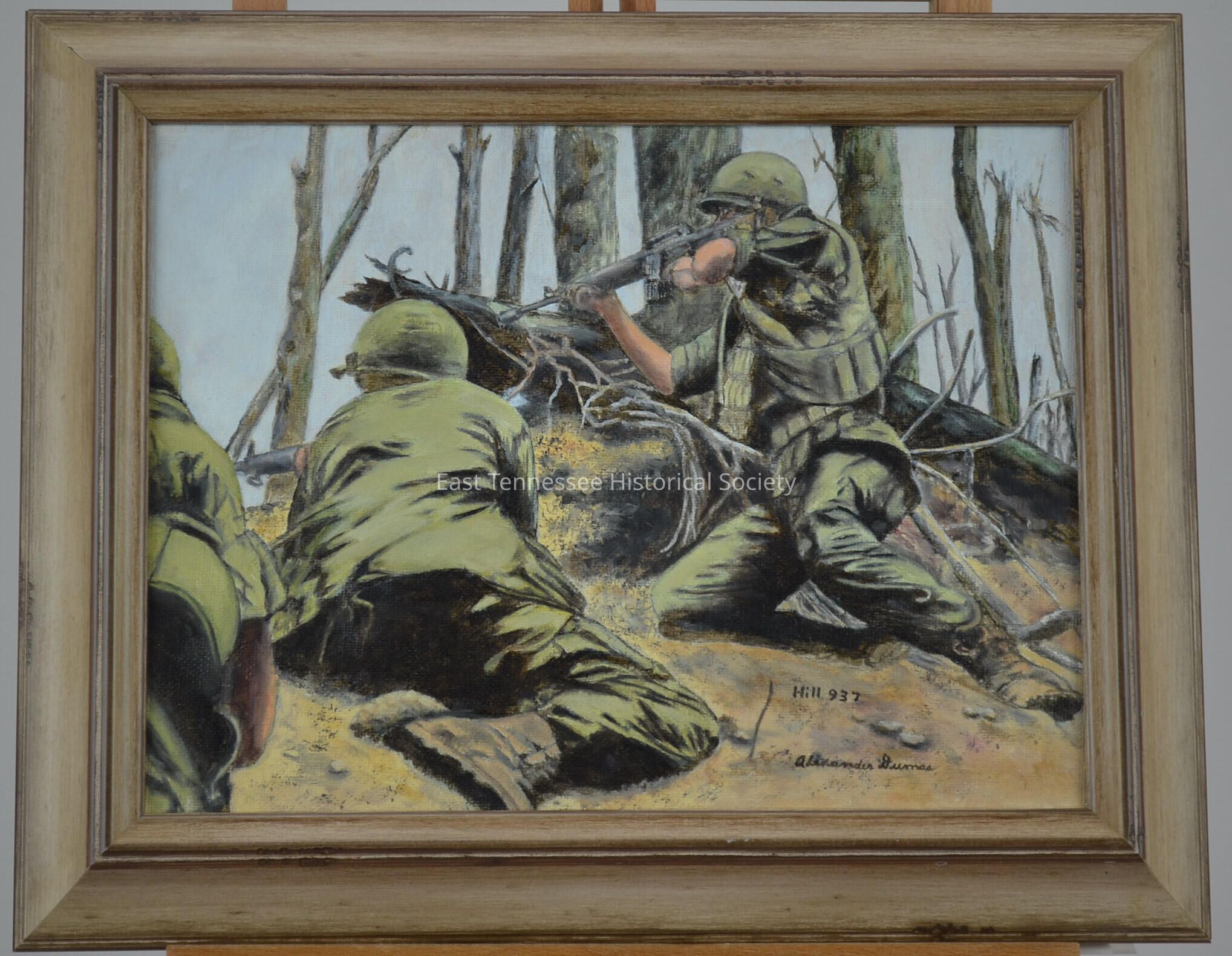 a) Painting entitled "Hill 937" by Alexander Dumas, depicts 101st Airborne assaulting Hill 937, signture "Alexander Dumas" at lower right corner, "Hill 937" written at lower right, 8 1/2"h x 11 1/2"w image size, date?