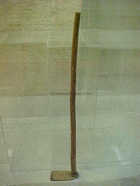 Hoe from Stinnett family; implement with thin, flat metal blade on long, wooden handle, 43 3/4"h x 4"w x 8"d, date unknown/1900?-1940?