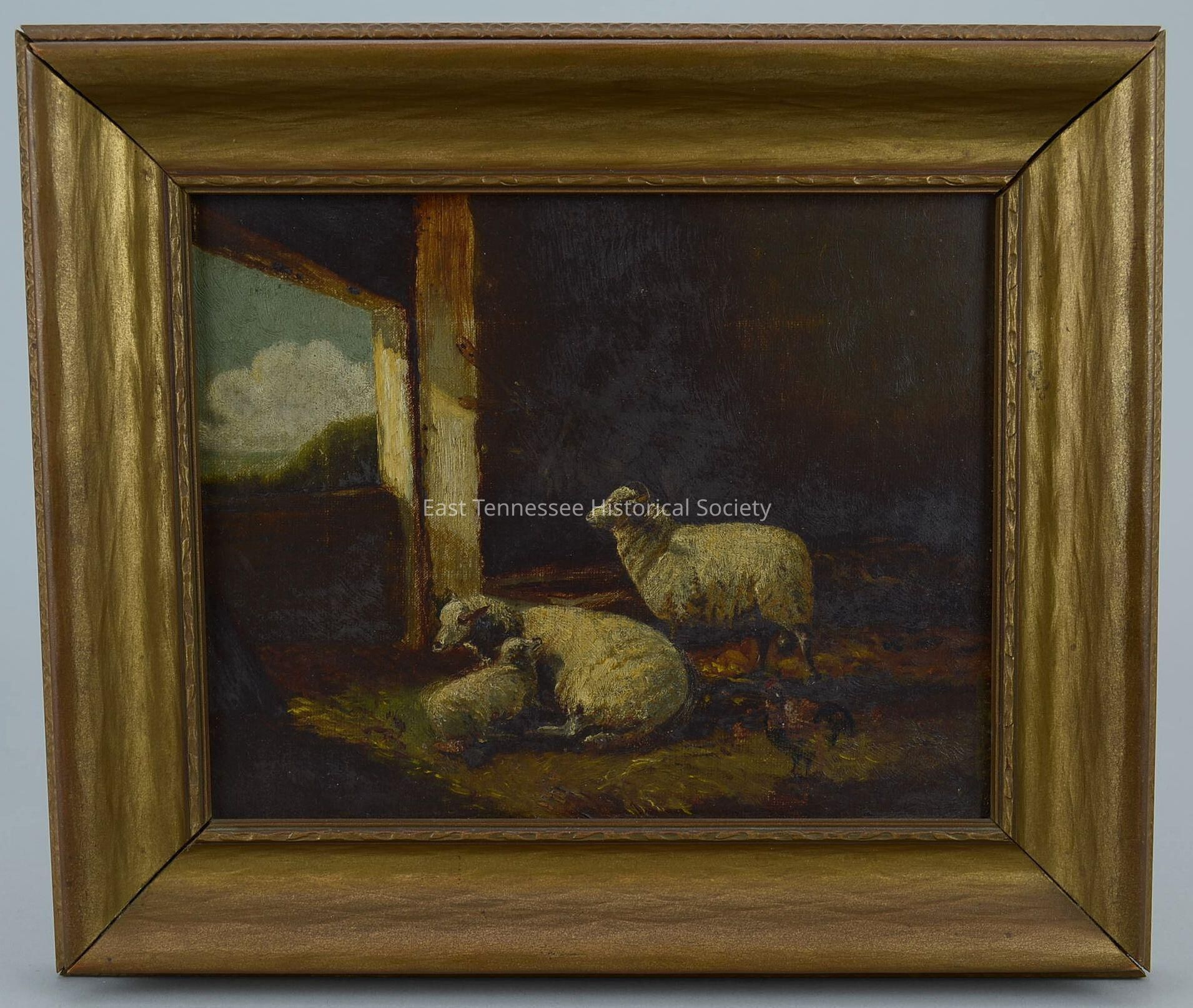 Painting attributed to Thomas Campbell*, unsigned, oil on wood, interior barn scene of sheep (parents and suckling lamb) and a chicken, lighting from opening facing onto a pastoral scene, 11 1/2" x 13" framed.Dimensions