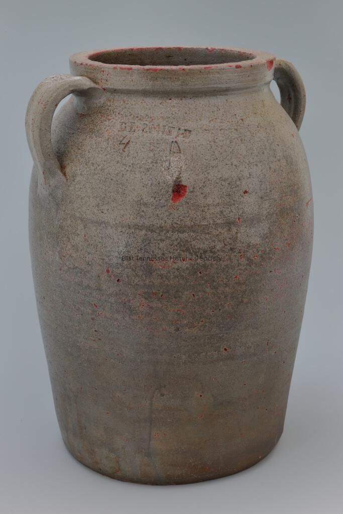 Large stoneware jar with strap handles made by D.L. Smith Pottery, gray glaze, impressed "DL SMITH"* and incised "4", remnants of red paint (paint removed before acquired by Meredith Smith), stamp "DL2MITID4," Blount County, 15"h x 11 1/2"w, 1870-1885.