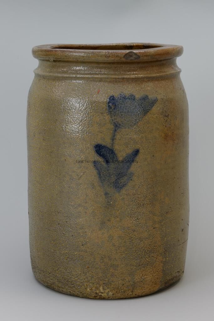 Glazed jar made by Decker, three blue tulips, 1873-1906.