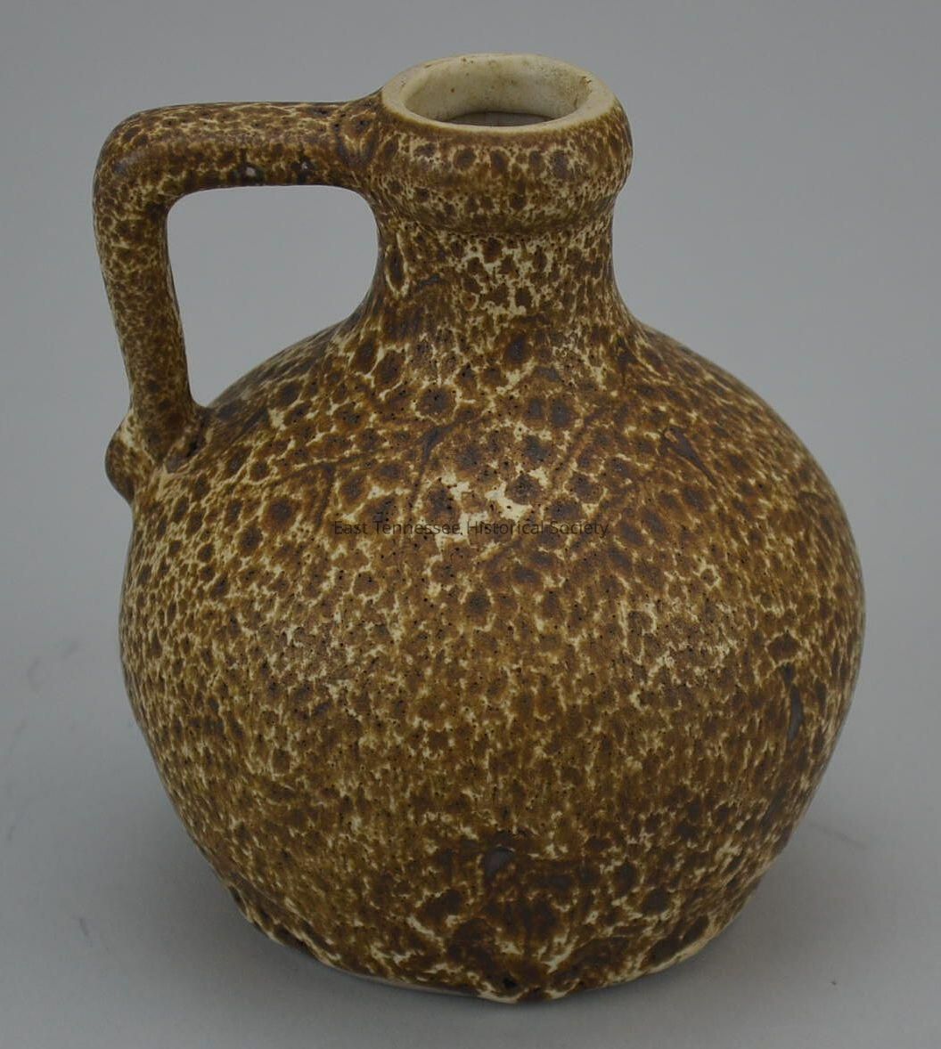 Jug, mottled dark-brown surface/molded crater glaze*, handle runs vertically from lip to center side, base incised "Pigeon Forge / Pottery / Tenn.," cream-colored interior, 4 3/8"h x 4 1/2" diam., perhaps 1960s.