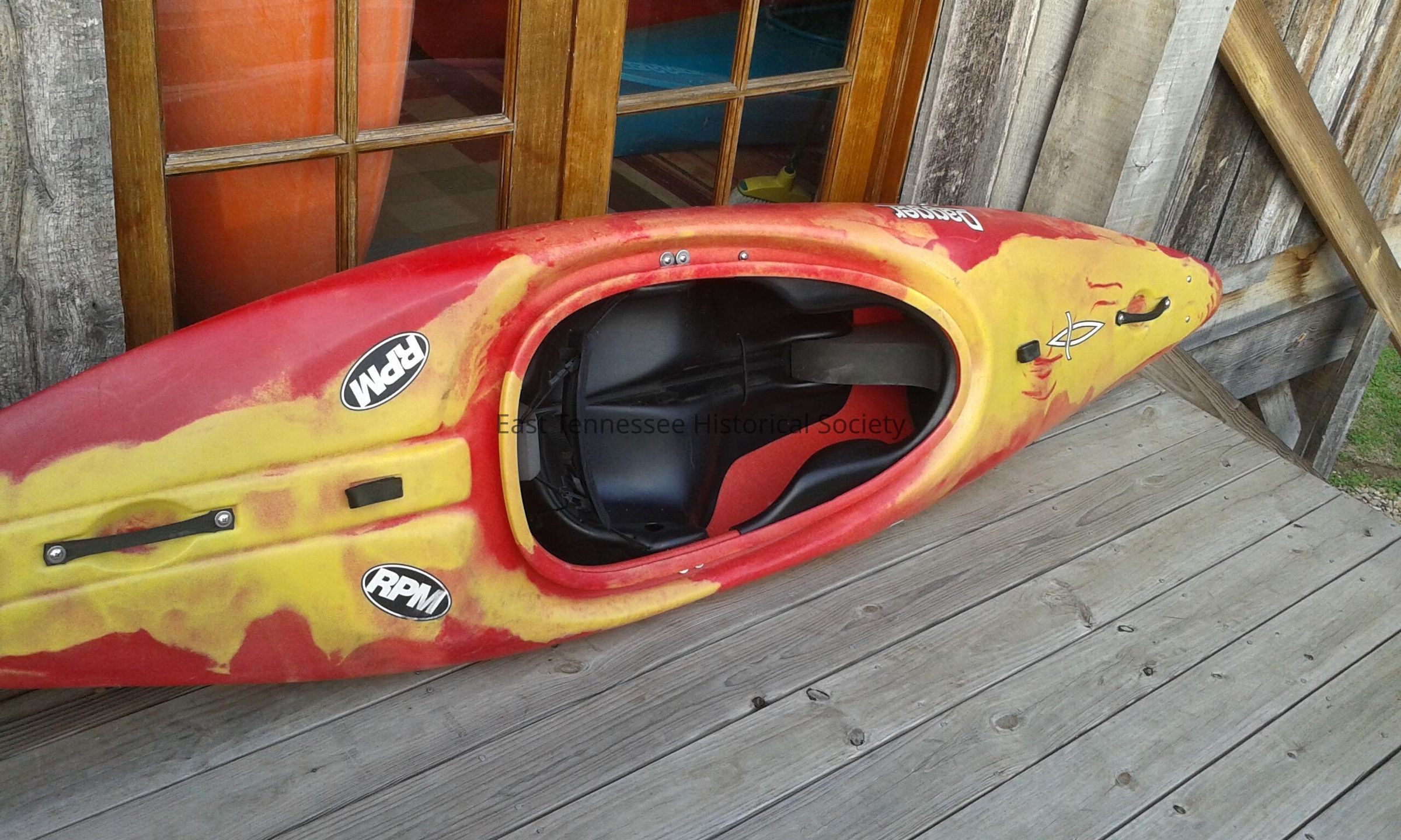 Whitewater kayak model RPM, red- and mango-colored molded plastic, one-piece interchangeable Aggressive Thighbraces with neoprene padding, thermolomed seat, adjustable backband, bulkhead toolbraces, minicell walls, deck loops and seat accessory loops, molded-in drain plug, recessed endcap inserts, Easy Grip grab loops, molded-in graphics "RPM" and "Dagger" on either side of bow, manufactured by Dagger Canoe, ?"h x 108"w x 24 1/2"d/34" x 19" cockpit,1999.