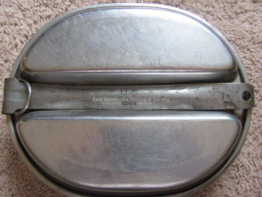 Mess kit (two piece) with three utensils of Ralph Freels, metal, 2 1/4"h X 6 3/4"w x 8 1/2"d, World War II/1941-1945.