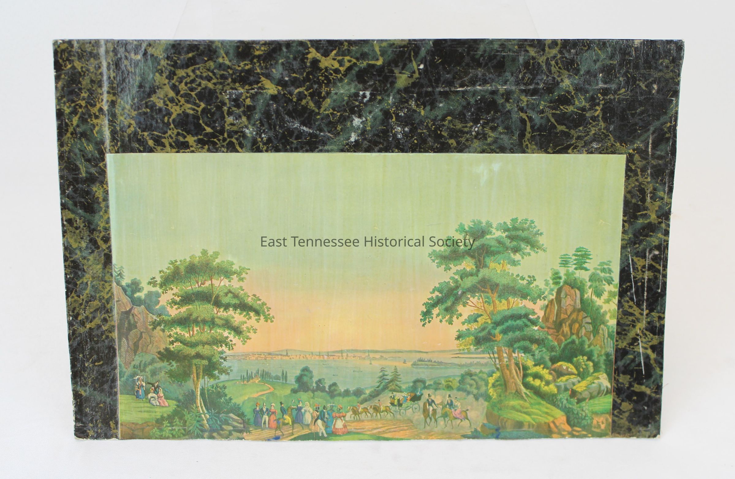 Cardboard backdrop with marblized border for child's stage set, black with green and gold, color illustrated scene at center of groups of people in period dress on hill overlooking harbor with sailing vessels, also shows carriage with horses and men and women riders, 11"h x 16 1/2"w, c. 1935?Made/Created