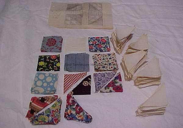 Pattern reads: " 4 per square of rectangular piece. all same/ color./ 4 per square of big triangular piece all same/ color./ 1 per square of the little square piece./ 12 white pieces per square of the little triangular piece/ 24 colored " " " " " " " " / (up arrow) all same color/ (obverse) rough graph of a finished/ square." Includes sketch of the square and pieces. Cut fabric includes: 1 white square, 28 colored squares 258 white/ ecru triangles. Paper templates for fabric: Triangles (7.625in x 3.875in), Square (2.125in x 2.25in) and small triangle (3.25in x 1.5in). All made from several layers of magazine pages that have been sewn together. Templates have notes concerning the number to cut from each block.Dimensions