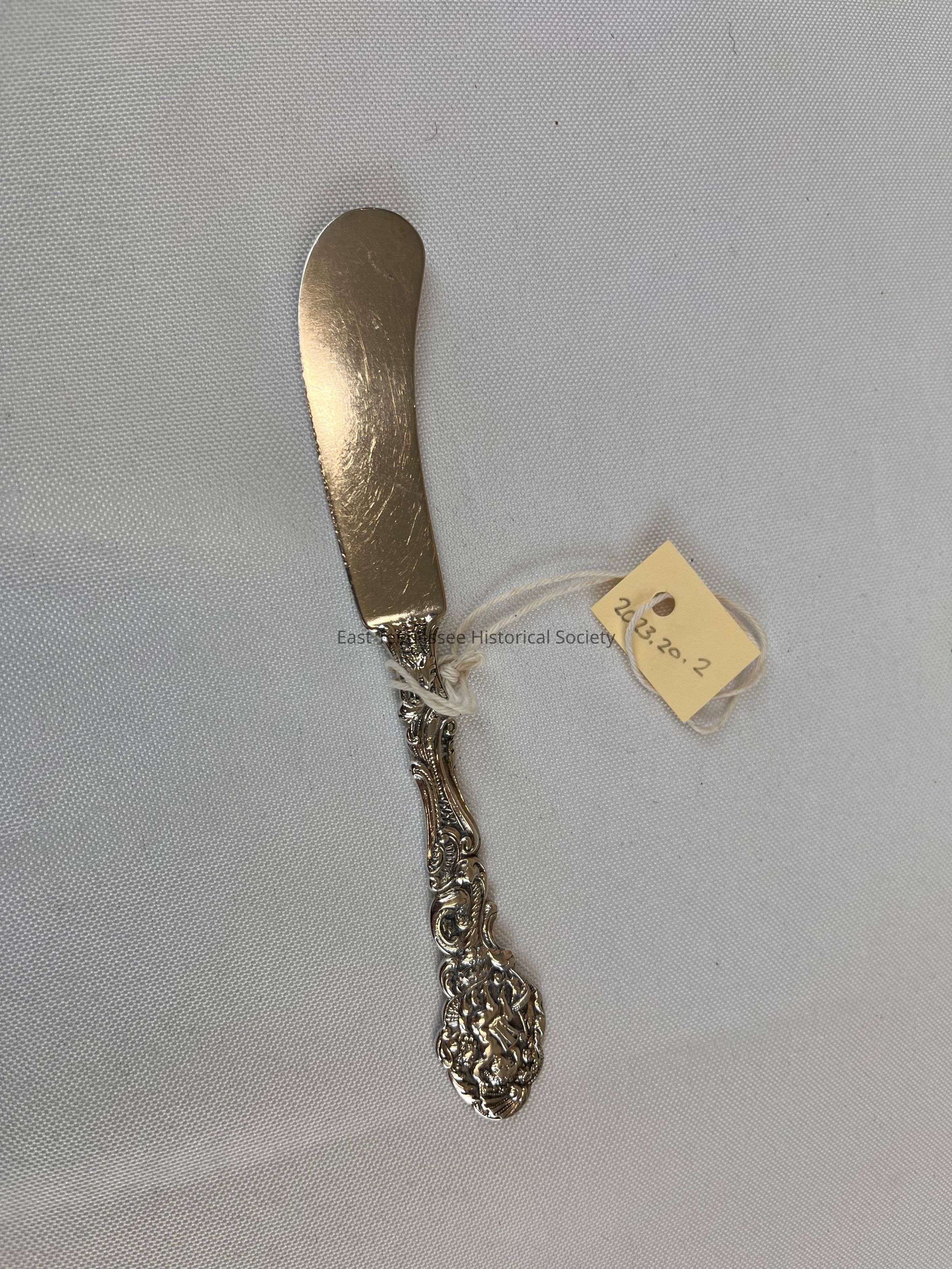 Gorham Silver, "Versailles" 1888, Butter Spreader Knife Silver cheese knife decorated with vine and floral elements, featuring a naked male figure with a musical instrument on the handle and initials "EMG" engraved.Made/Created