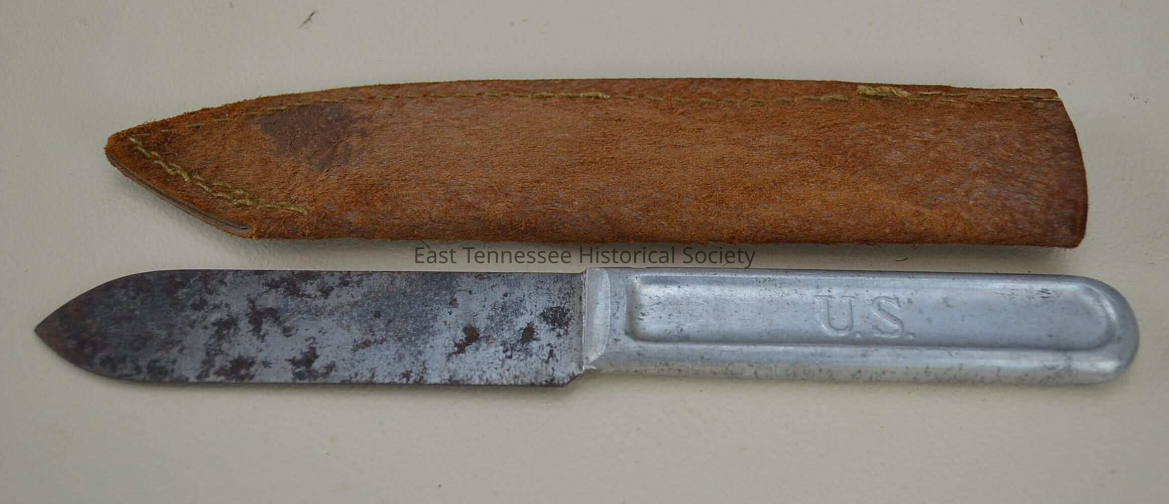 a) Mess kit knife (military issue) belonging to Robert Barnes "Bob" LaForge Jr. (1885-1956), metal/tin plated steel or iron with cast aluminum handle, Model-1910, marked "U.S." on left side at handle end top, marked "L.F.&C. / 1917" on reverse, manufactured by Landers, Frary & Clark, 7 1/2"h x 7/8"w, WWI/1917.