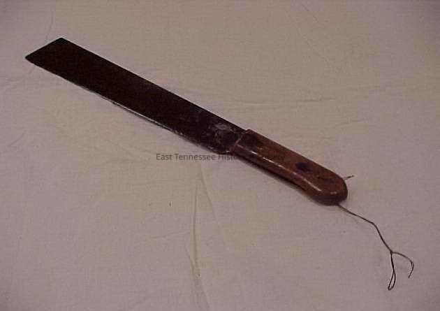 Corn knife with long metal blade and short wooden handle. Openings at front and back of handle to facilitate installing the blade of replacing blade. Wooden handle has a round bottom that comes to a point, and extends a bit forward at the front. A hole runs through the short axis of the handle. Stiff twine is threaded through the hole.Collection