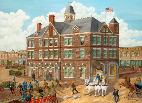 "Knoxville City Hall and Central Fire Station, 1896," W. R. Briscoe, oil on canvas, signed "W. Russell Briscoe" and dated bottom right, 21 13/16" x 29 5/8" with 2" gold-painted wood frame, 1971.Collection