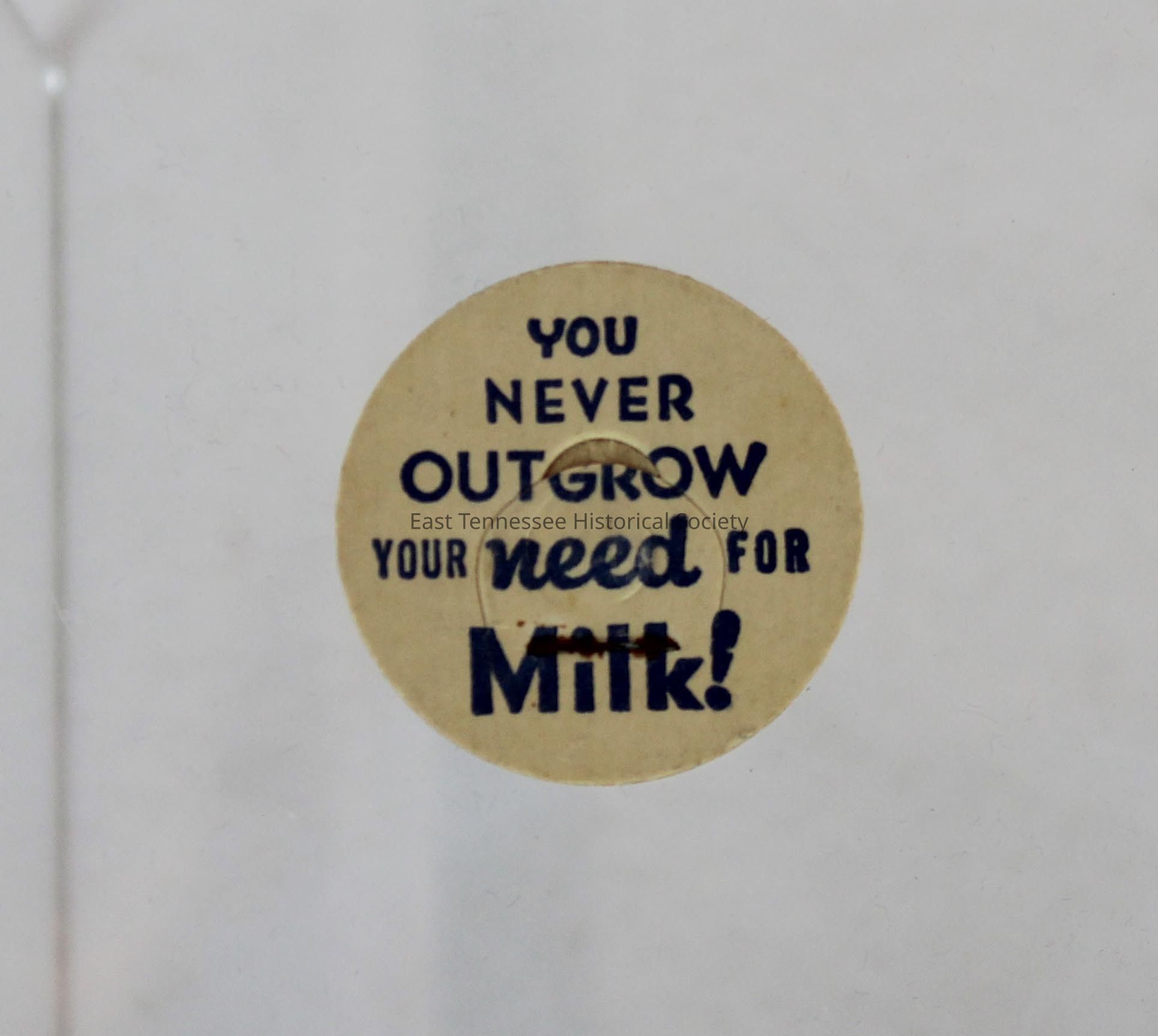 Milk bottle tab marked YOU / NEVER / OUTGROW / YOUR need FOR / Milk!" [all lettering in blue], Kreis family dairies, mid-1950s.