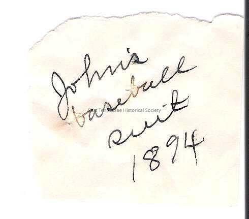 Label marked, "John's baseball suit / 1894." Appears to have been formerly fastened to uniform as evident of pin holes.