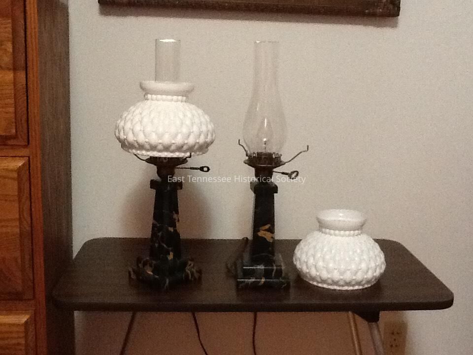 Pair of lamps made by master carver Albert Milani asa a gift for Burl H. Underwood, black with gold/white/gray veining, square base with arches and multiple sections, wired for electric with brass finish socket and holder, glass chimney, milk-glass hobnail shade, Chandelier light bulbs, 11 5/8"h x 6"w x 6"d.