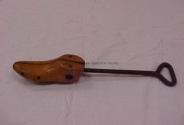 Shoe stretcher. A block of wood in the shape of a shoe has been split into a left and right side top of wood marked "5" "B(?)OUGHTON/--ELOHER" "MOVING PARTS". At the back of the shoe is a long metal screw that when turned by its triangular handle will cause a metal wedge inside the shoe to travel along a grove cut in the wood causing the shape of the shoe to widen, especially at the toe. Wooden shoe has a golden tint.Collection