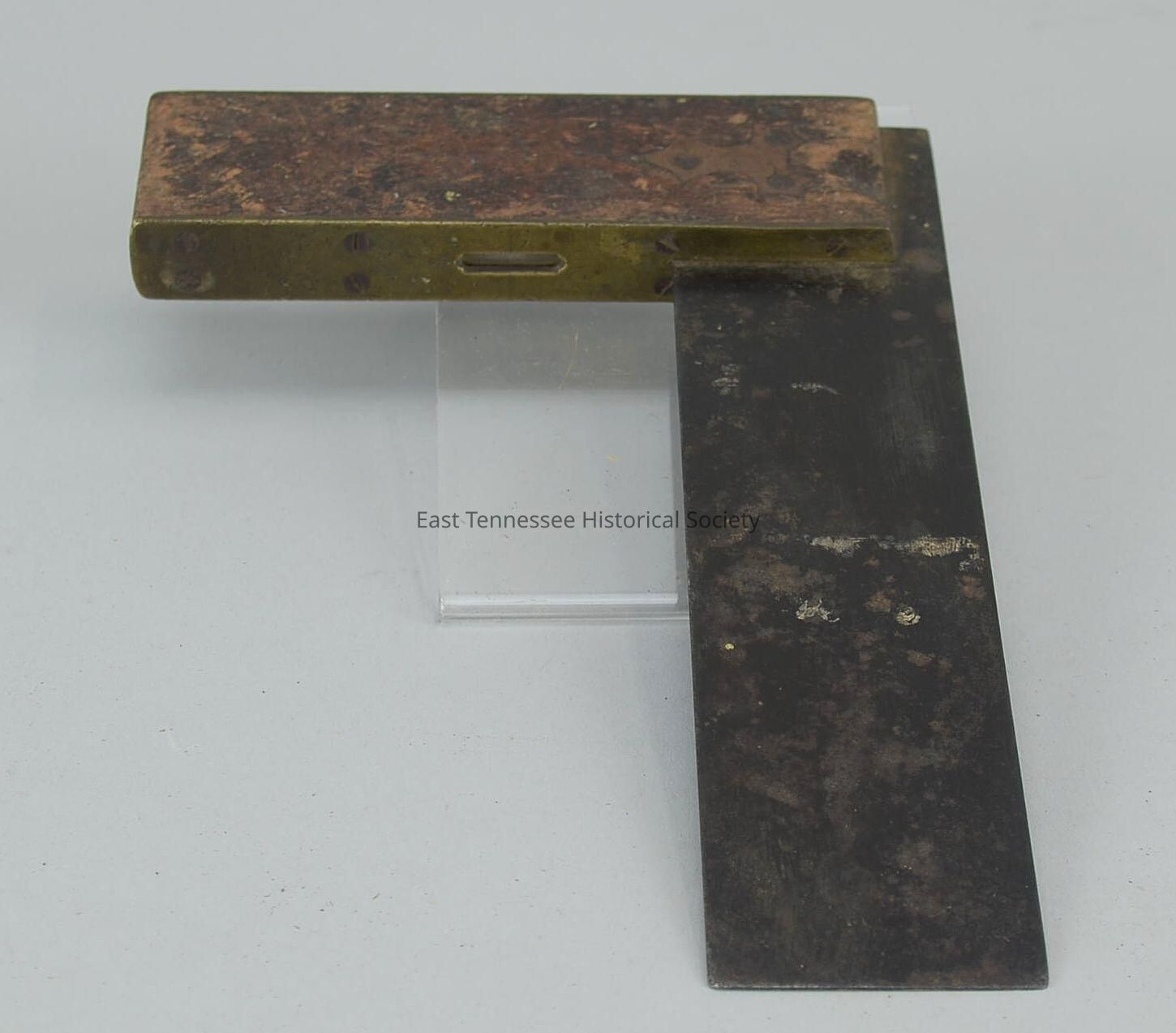 Tri-square and level combo (combination should indicate pre-1900), 9 1/2" x 2 1/8" flat metal rectangle inserted into 6" x 3/4" wood rectangle to mark square, brass screwed onto top and bottom wood piece with stylized arrow shape on each side with three metal fasteners holding metal piece, small liquid-filled level inserted into wood with hold cut in brass, marked with Social Security number "415-32-1867" etched onto metal square, manufacturer unknown/possibly Stanley/looks like Stanley, 9 1/2"h x 3/4"w x 6 3/8"d, 1880s-1890s.