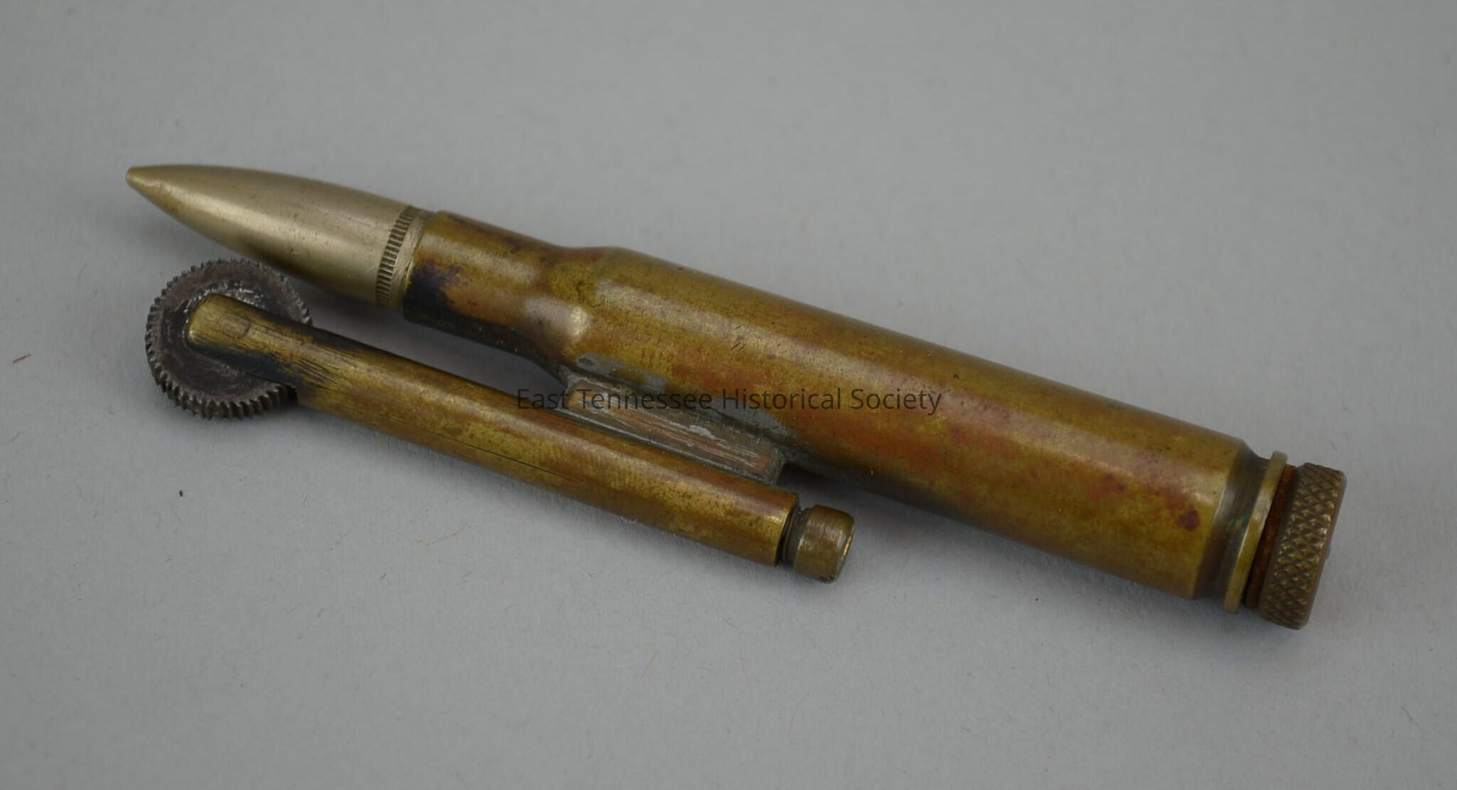 Trench art lighter belonging to Robert Barnes "Bob" LaForge Jr. (1885-1956), made from used WRA Co. 17 shell casing, metal (brass), flint chamber with wheel, screw-on bottom for lighter fluid, cotton stuffed into shell, maker unknown, 3 3/8"h x 3/4"w, c. 1917Made/Created