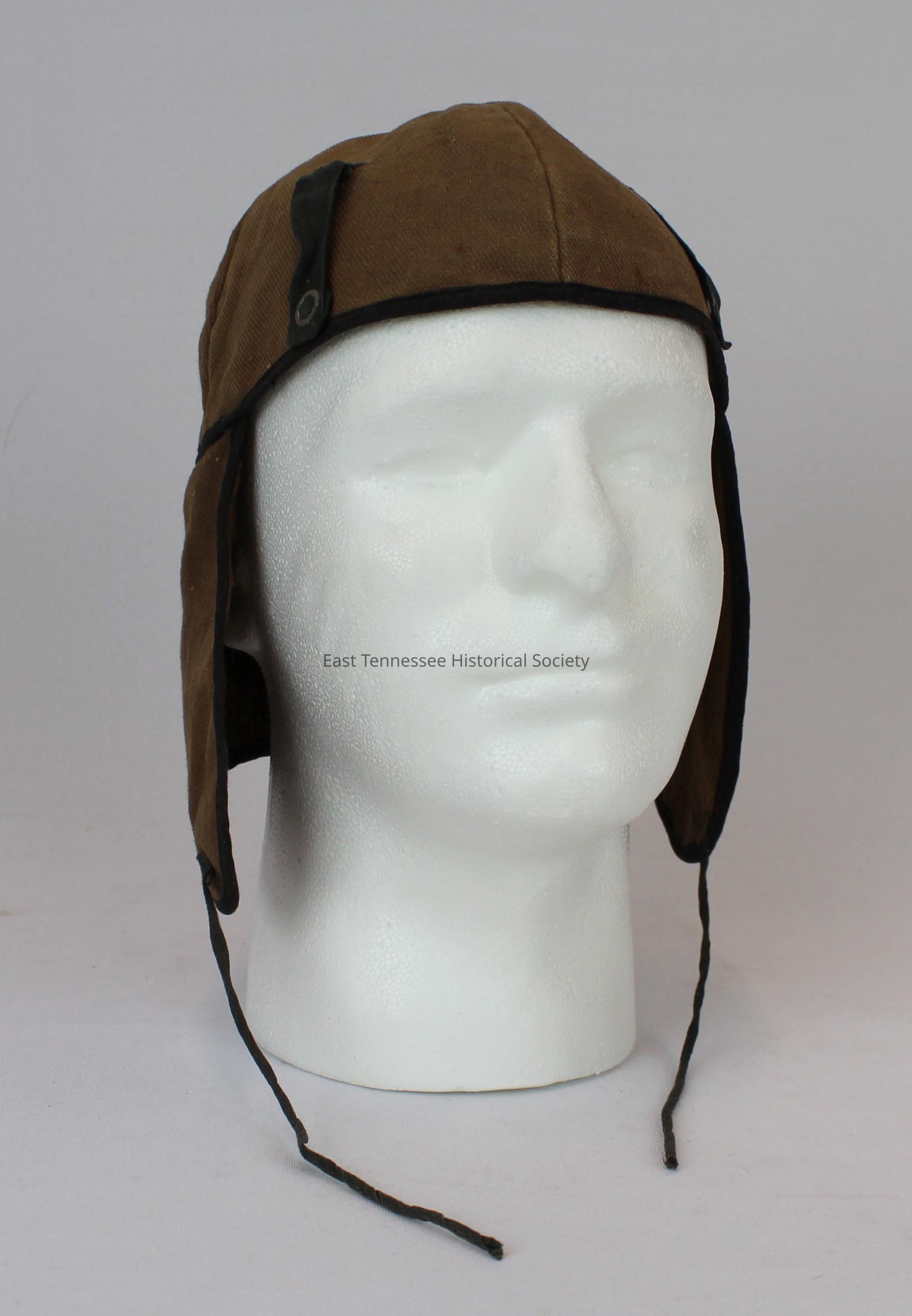 Helmet liner with ear flaps and strings to tie under the chin from American Enka, light brown canvas with dark brown trim around the edges and dark brown strings, 4 dark brown straps (2 in the front and 2 in the back) that are sewn onto the cap at one end and then have metal snaps at the other end, metal snaps have "RAU F. CO. PROV. R.I." stamped on them, 4 sewing seams that divide the cap into 4 parts that meet at the top center, interior is lined with brown wool, 17"h x 7"w x 8"d, c. 1950.Made/Created