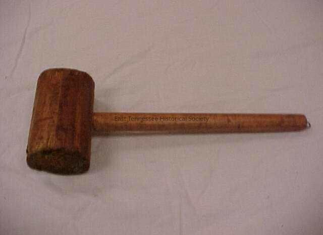 Mallet or maul. Large wooden cylinder fixed to a long wooden handle. A long bolt and nut have been installed on the left and right side of the mallet. Metal loop driven into end of handle. Small rectangles cut out of wood where nuts were screwed onto bolts.Collection