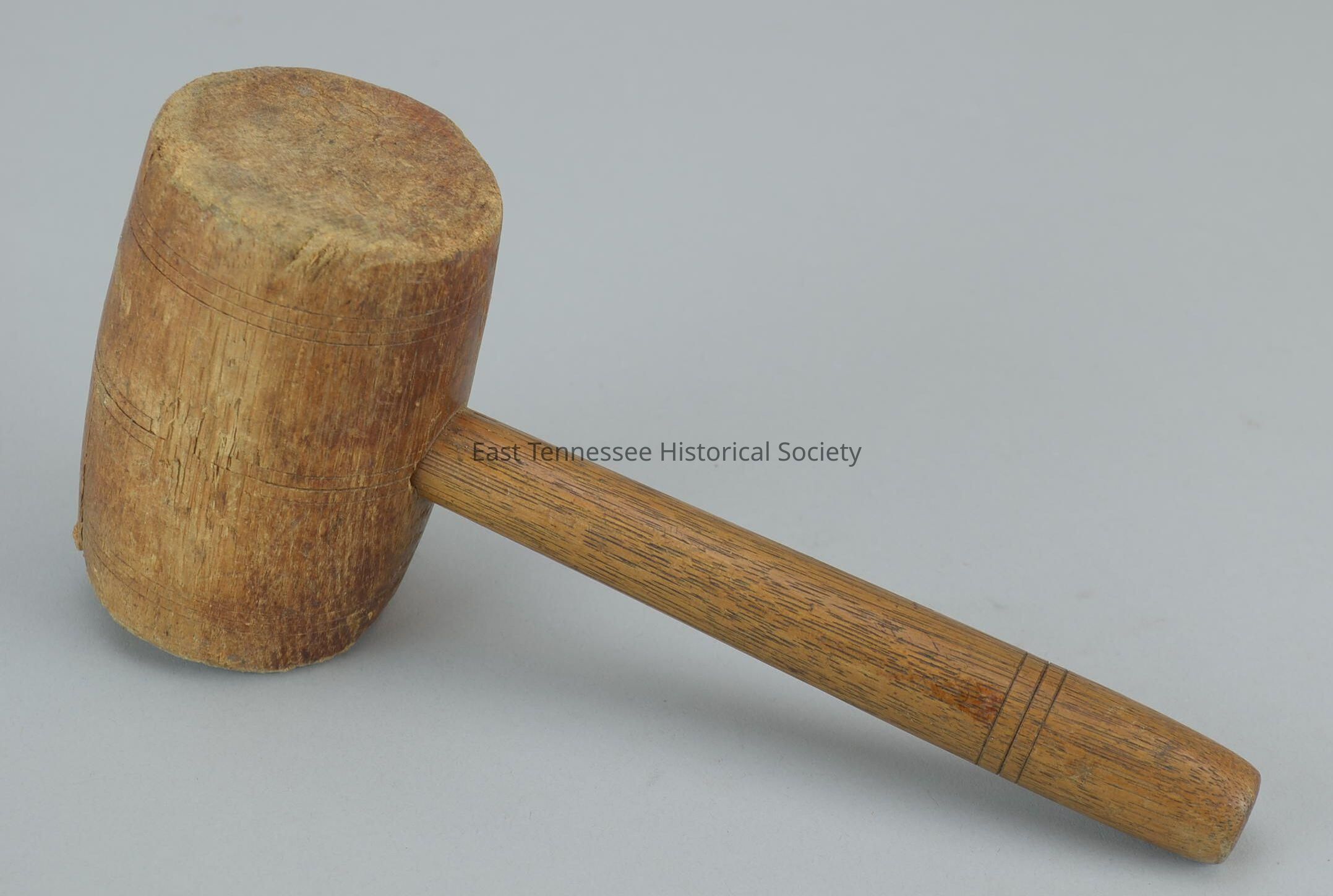 Mallet, varnished wood, tapered hickory or oak handle fitted through head, three evenly spaced sets of three lines carved around middle head plus set of three around lower handle 1 3/4" from end, manufacturer unknown, 10"h x 4 1/4"w x 2 3/4"d, date unknown.